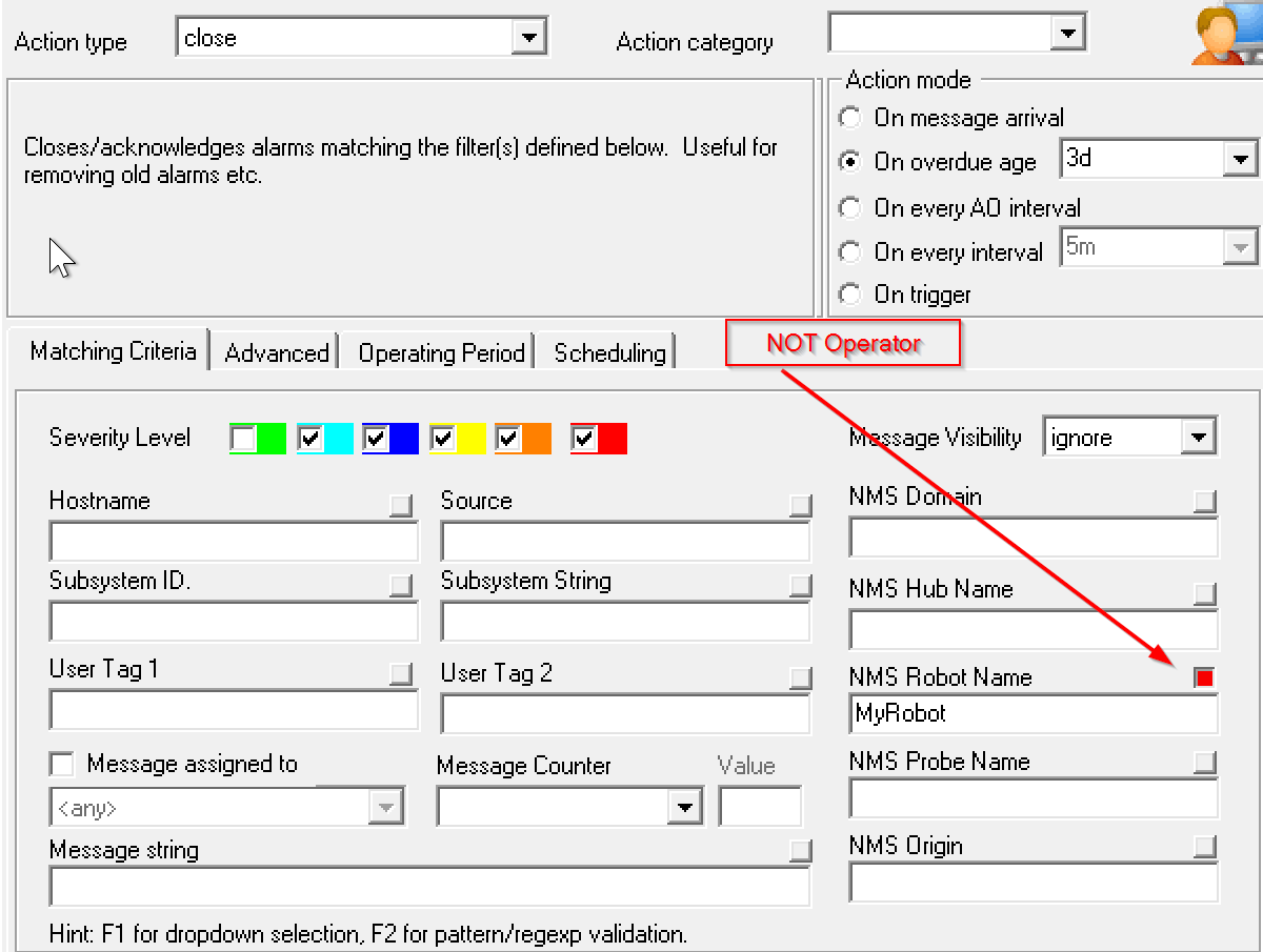 For example, the following shows an Auto-Operator which automatically closes all alarms after 3 days, EXCEPT alarms from a robot called "MyRobot".