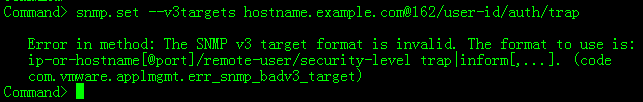 Command>snmp.set --v3targets hostname@port/user-id/secLevel/trap