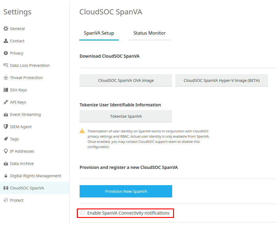 E-mail notifications are sent to the e-mail address of the SpanVA owner and the e-mail addresses listed in the CloudSOC SpanVA configuration under the "Enable SpanVA Connectivity notifications". Both will need to be adjusted to change the recipient/s.