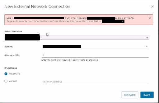 Note : You can connect an external network that is backed by a VLAN segment only to one edge gateway.