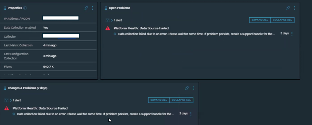 To resolve the data collector issue, please navigate to Settings > Data Source > Click on Edit for NSX-T Data source > Uncheck this "Enable Latency metric collection" > Click Save/OK.