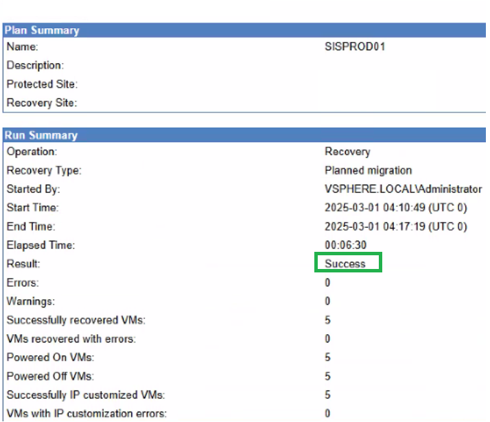 A planned migration was initiated, and all virtual machines in the recovery plan successfully failed over.