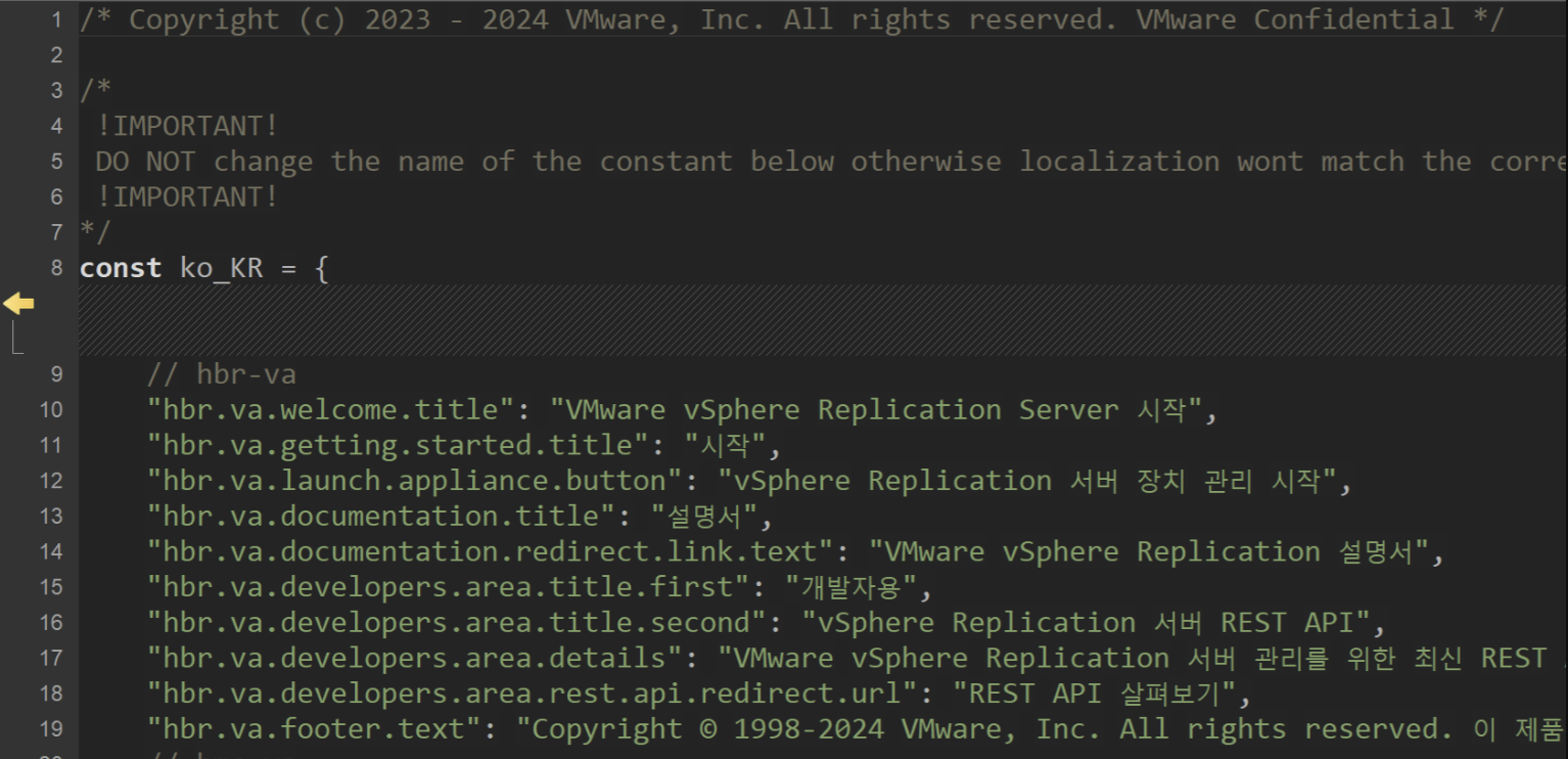 [ /opt/vmware/drconfigui/webapps/configure/app/landing/i18n ]# ls -ltotal 92-rw-rw---- 1 tomcat tomcat 8456 Mar 11 03:59 de.js-rw-rw---- 1 tomcat tomcat 7582 Mar 11 03:59 en.js-rw-rw---- 1 tomcat tomcat 8774 Mar 11 03:59 es.js-rw-rw---- 1 tomcat tomcat 8774 Mar 11 03:59 fr.js-rw-rw---- 1 tomcat tomcat 8538 Mar 11 03:59 it.js-rw-rw---- 1 tomcat tomcat 9252 Mar 11 03:59 ja.js-rw-rw---- 1 tomcat tomcat 8154 Mar 14 06:44 ko.js-rw-rw---- 1 tomcat tomcat 7294 Mar 11 03:59 zh-CN.js-rw-rw---- 1 tomcat tomcat 7412 Mar 11 03:59 zh-TW.js