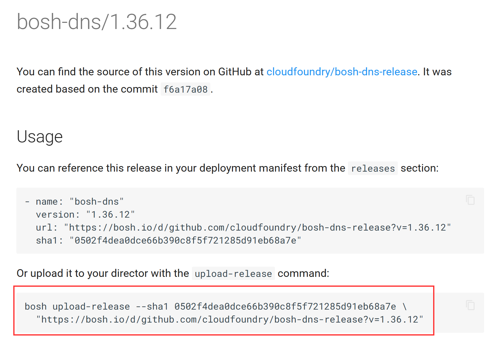 $ bosh config <bosh-config-id> jobs: - name: bosh-dns release: bosh-dns releases: - name: bosh-dns version: 1.36.12# bosh upload-release --sha1 0502f4dea0dce66b390c8f5f721285d91eb68a7e "https://bosh.io/d/github.com/cloudfoundry/bosh-dns-release?v=1.36.12" --fix