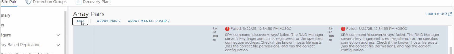 2025-05-07T05:15:51.088Z error vmware-dr[01522] [SRM@6876 sub=SraCommand opID=6bdc815b-71b1-###-##-####-reloadAdapters:cde3:cde3:3##:2445:###:c114:###:bf59:###:##6b] Command discoverArrays's stderr