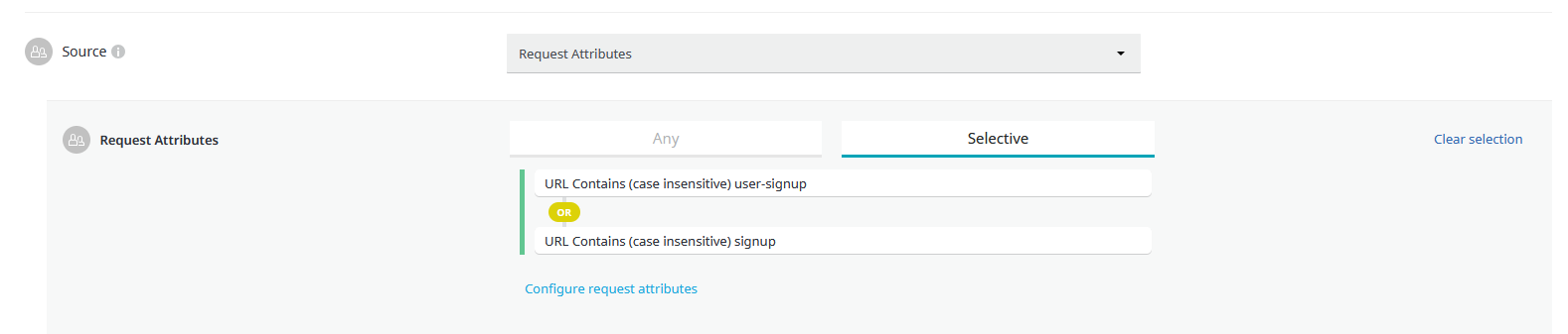 For Source section, change the Platforms and Browsers to Request Attributes, and configure request attributes, for URL contains user-signup, add OR, then URL contains signup: