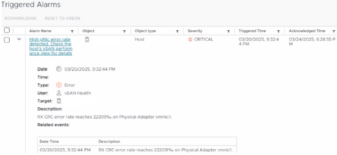 In vCenter UI, Host > Monitor > Triggered Alarms shows error as High pNic error rate detected.