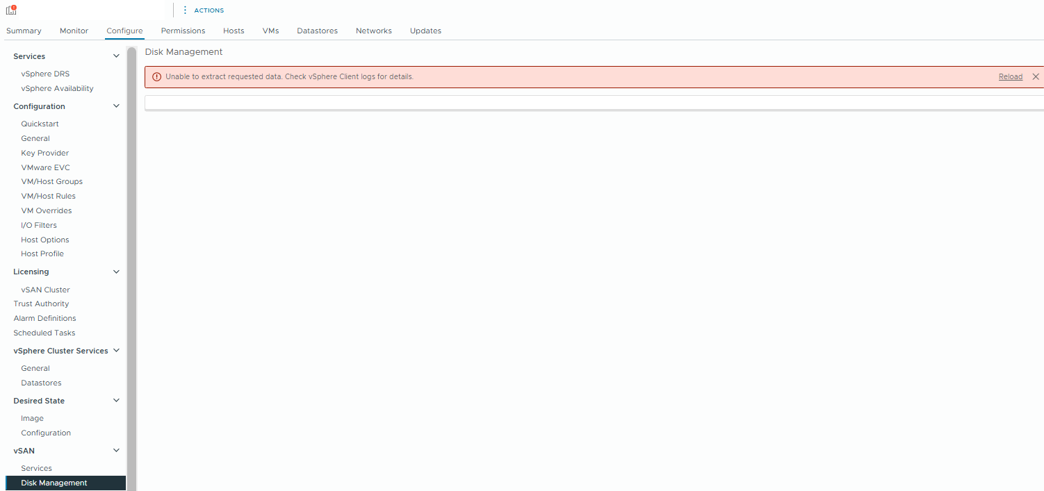 vSAN Disk Management fails to load in the HTML5 vSphere client, with the below error: