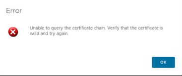 The error message "Unable to query the certificate chain, Verify that the certificate is valid and try again." is appearing when trying to add a new node to the cluster in Aria Operations.