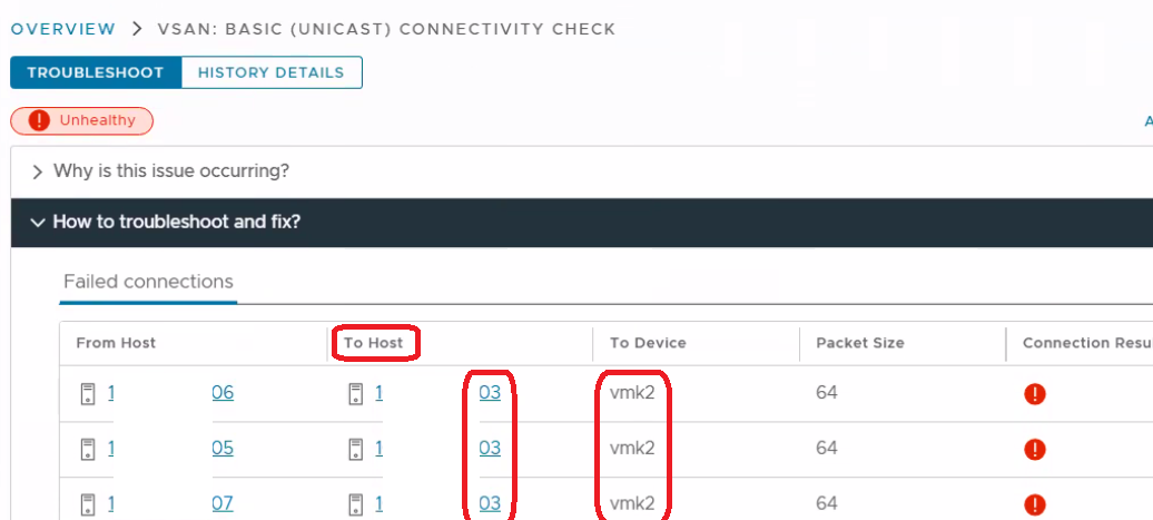 The kernel services tags were inconsistent on one host. The vSAN and vMotion tags were swapped on a host as compared to other hosts in the cluster. In the screen grab, it is evident that the 3 hosts have issues with 1 host. The 1 host's vmk2 must be investigated for MTU size mismatch or other misconfiguration.