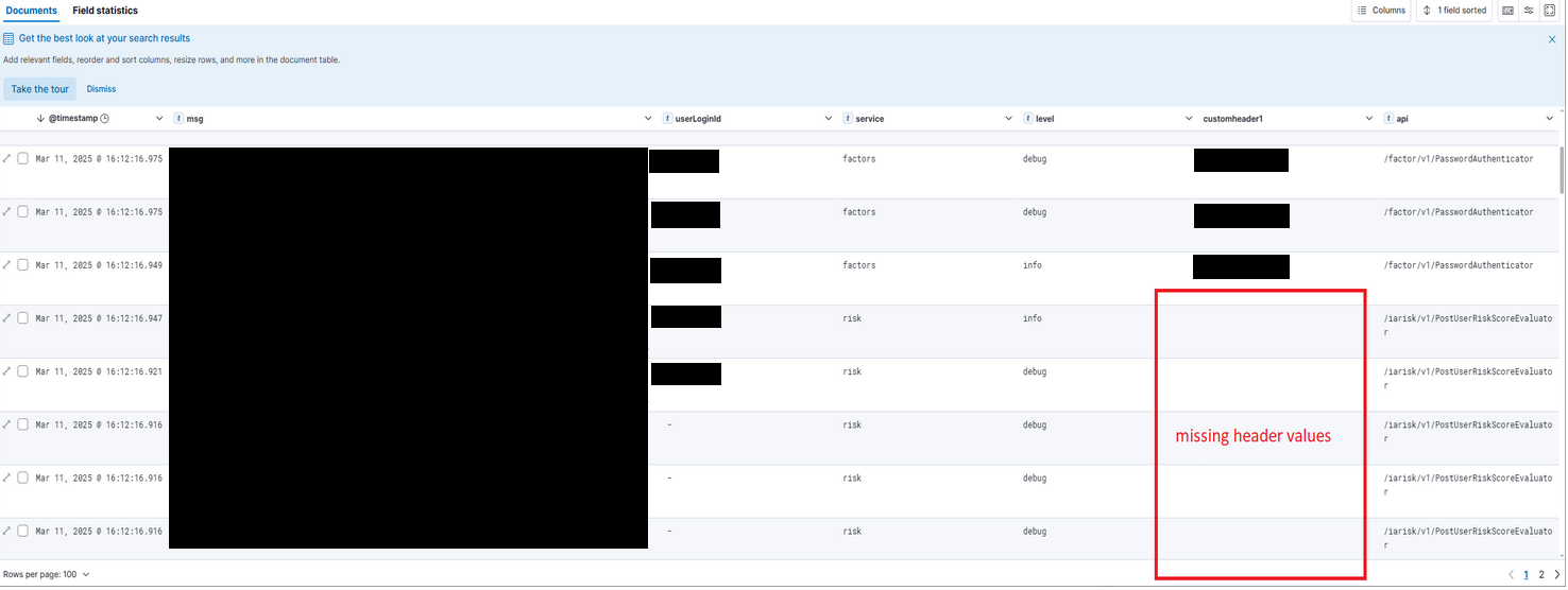 The picture below shows that customheader1 and customheader2 are set, and the expectation is that their values will be logged in Kibana. However, this logging does not work for some APIs.