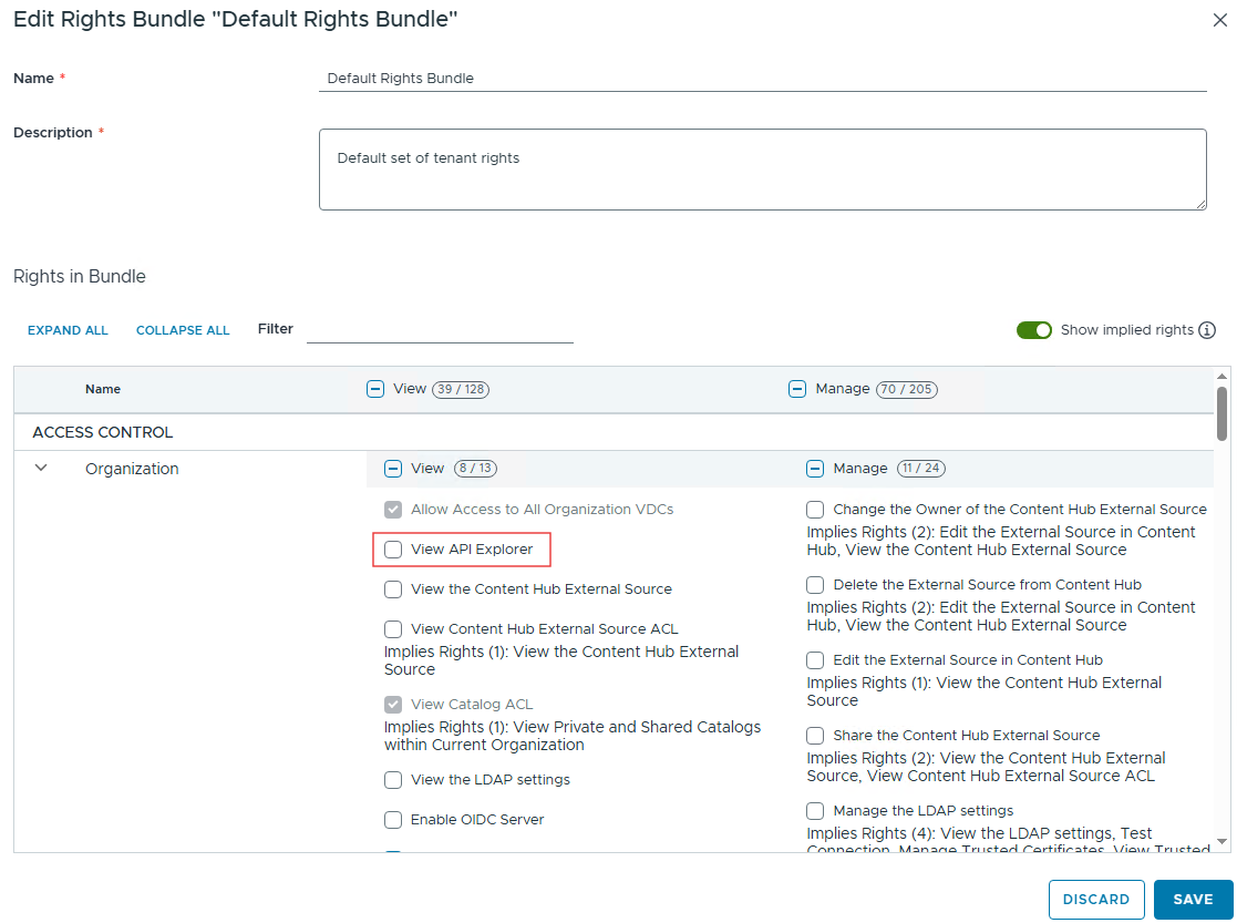 5. Search and enable the following right: Access Control > Organization > View > View API Explorer