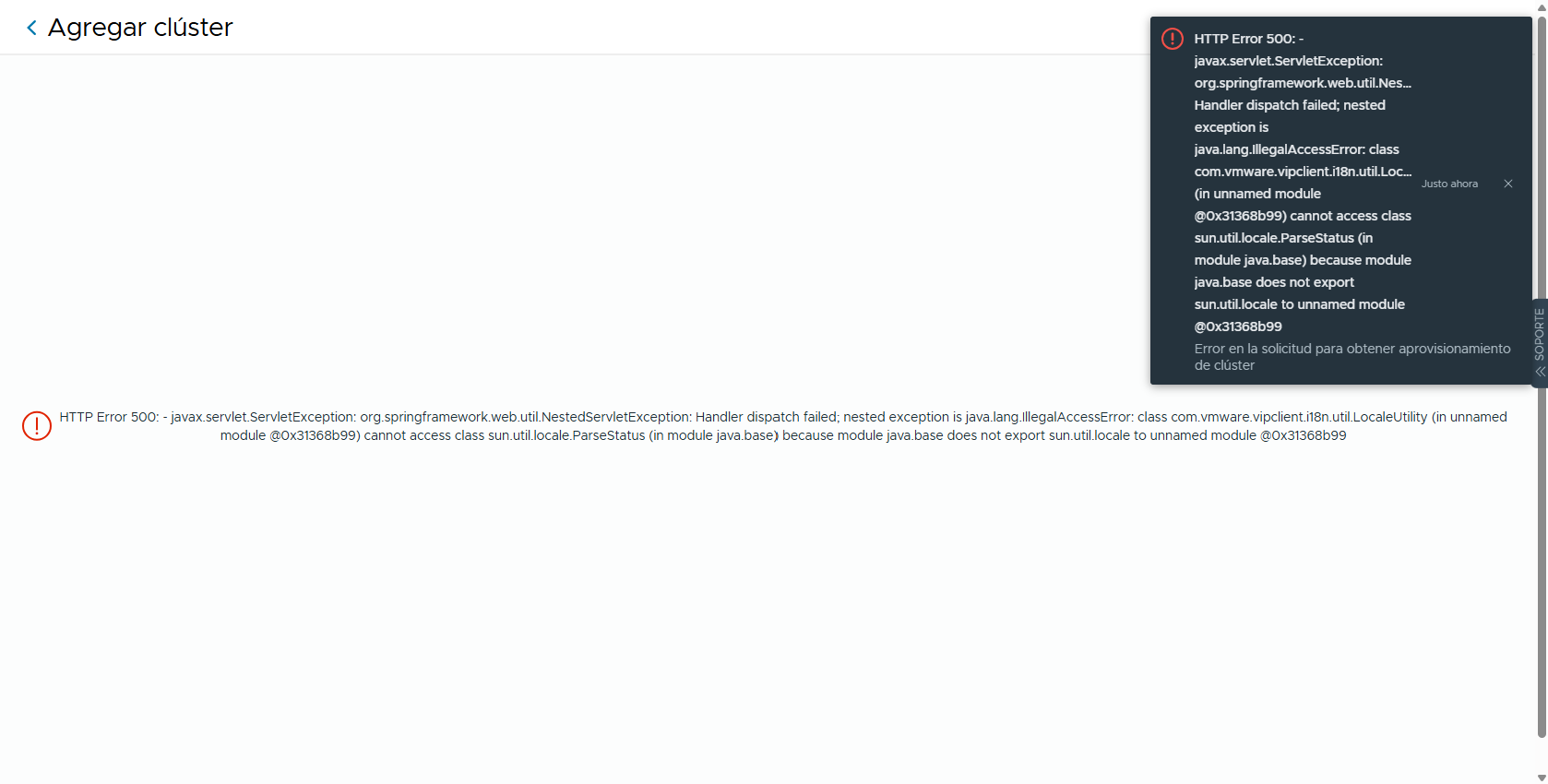 HTTP Error 500: - javax.servlet.ServletException: org.springframework.web.util.NestedServletException: Handler dispatch failed; nested exception is java.lang.IllegalAccessError: class com.vmware.vipclient.i18n.util.LocaleUtility (in unnamed module @0x31368b99) cannot access class sun.util.locale.ParseStatus (in module java.base) because module java.base does not export sun.util.locale to unnamed module @0x31368b99
