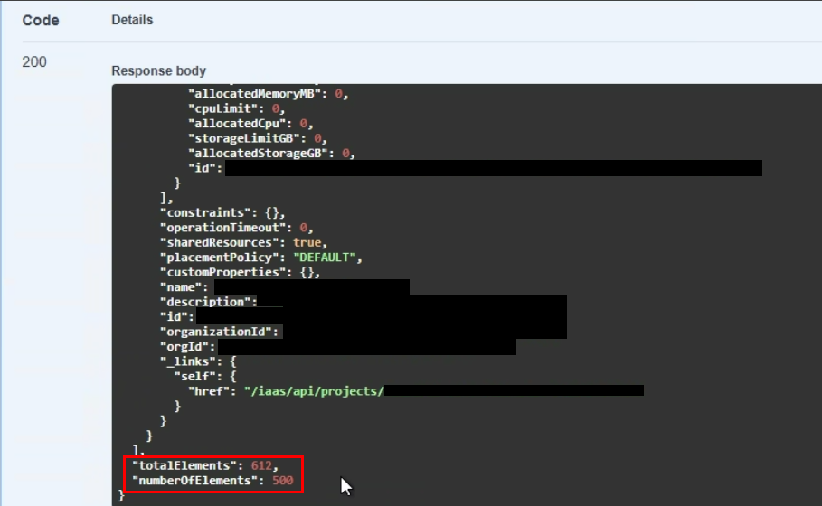The IAAS API's "totalElements" and "numberOfElements" fields confirm the default pagination limit.