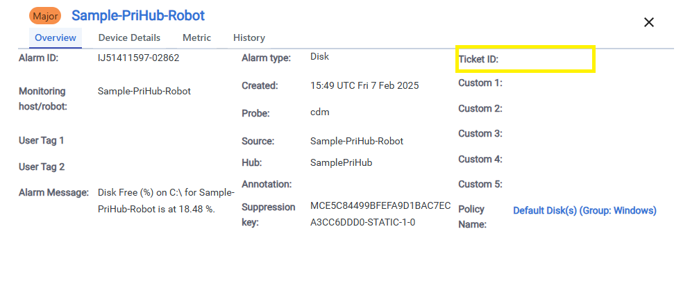 When the Custom 4 (custom_4 or in nas alarm enrichment rules, udata.custom_4) field is populated, the Ticket ID field is also populated with the text. When the Custom 5 field is populated with a valid URL, the link in the Ticket ID field will use that URL.