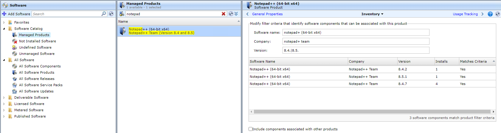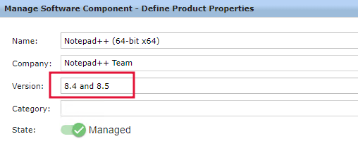 6. We can later on further modify the existing Software Product, and add new versions, in this case we would want to add known but not managed 8.7.x - in that case we would modify the Version field in General Properties to something like "8.4 and Higher" and Save, then in Inventory we specify "8.4|8.5|8.6|8.7":