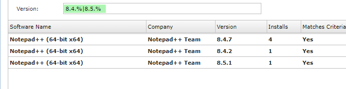 4. Let's assume that we wanted to Combine all Notepad++ version 8.4.% and 8.5.% but not include 8.7.% - So our version Filter would look like: "8.4.%|8.5.%":