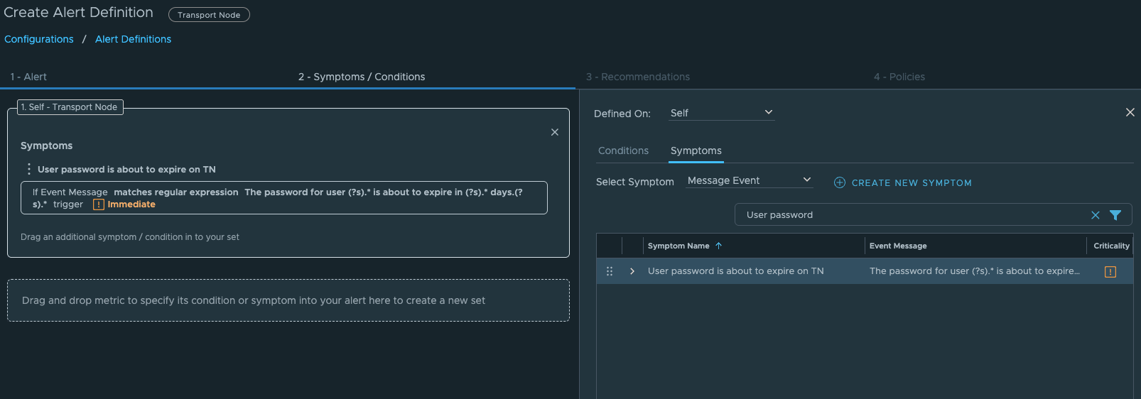 Note: The following guide is for the NSX alert "User password is about to expire.". For other alarm types, need to change the message event regex accordingly: