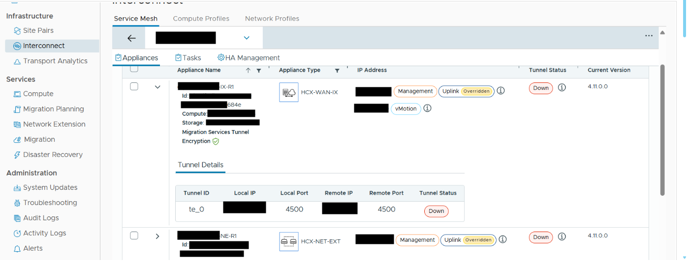 New HCX deployment to destination site is down. Tunnel is not up for HCX Appliances.