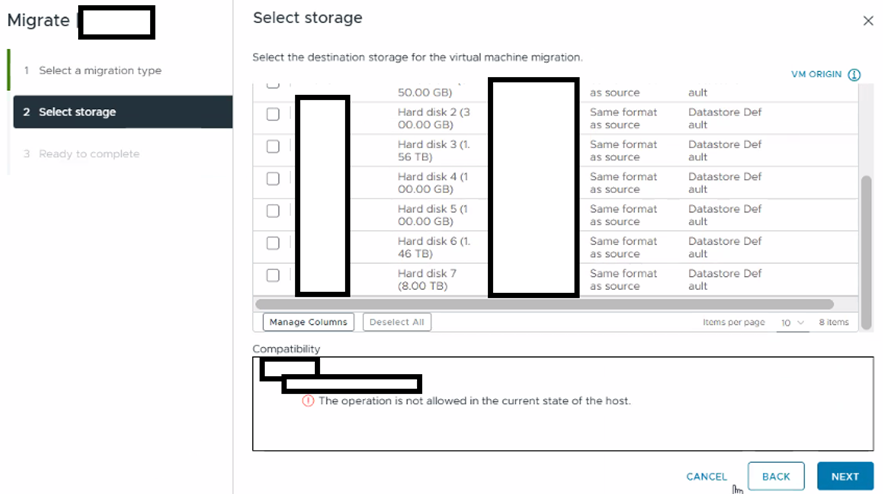 Getting an error in vCenter Web Client UI while attempting live Storage vmotion:
