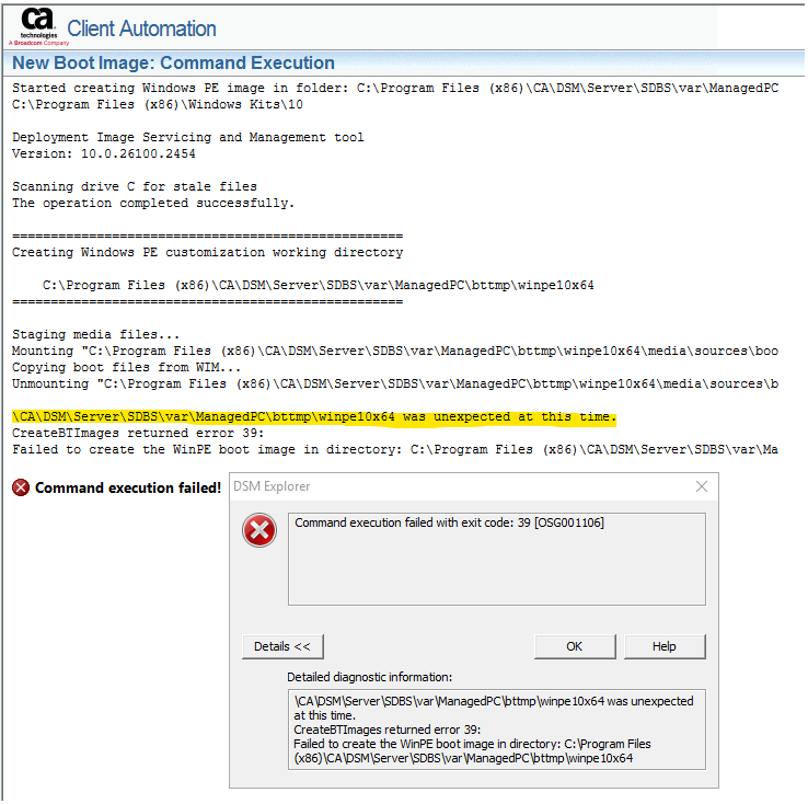 OSIM_IPS |CreateBTImages |CreateBTImages |000000|ERROR | Failed to create the WinPE boot image in directory: C:\Program Files (x86)\CA\DSM\Server\SDBS\var\ManagedPC\bttmp\winpe10x64