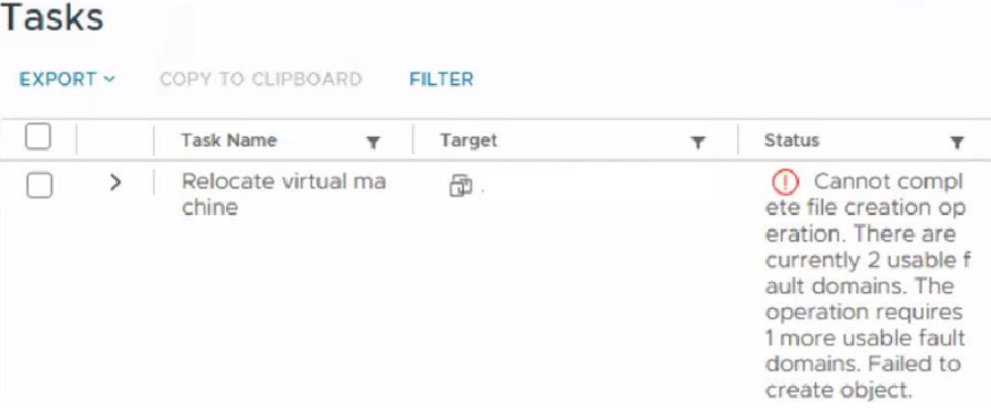 1. vMotion fails with error "There are currently 2 usable fault domains. The operation requires 1 more usable fault domains. Failed to create object"