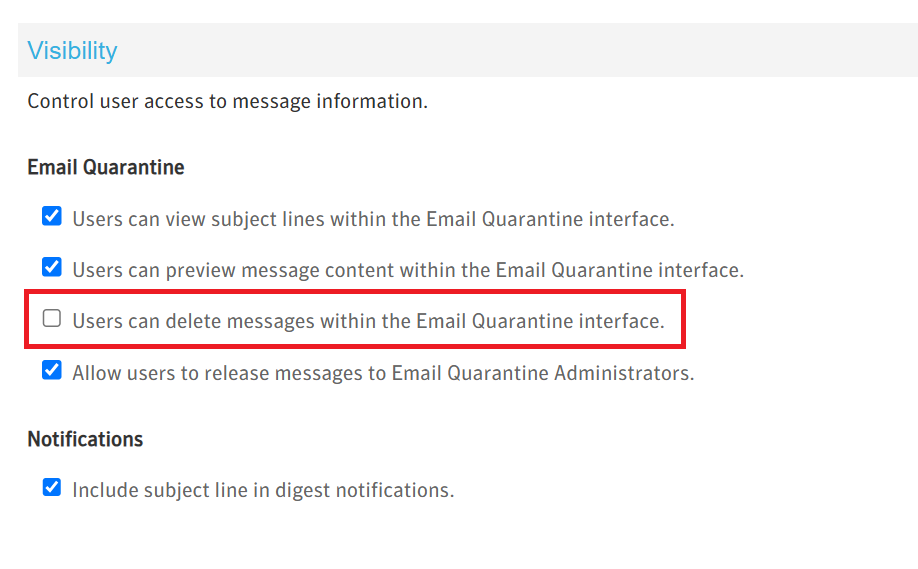 The administrator can enable the option below to allow users to manage/delete emails from the user quarantine portal.