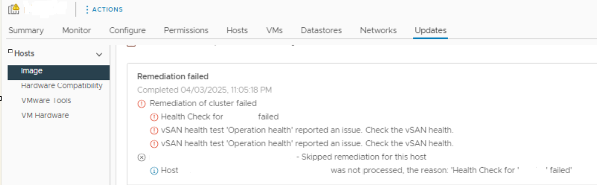 The ESXi patch upgrade from version 7.0.3 (build 21930508) to 7.0.3 (build 24585291) failed due to a vSAN Skyline Health alert encountered during the process. The cluster remediation was unsuccessful, with the vSAN 'Operation Health' check reporting an issue.