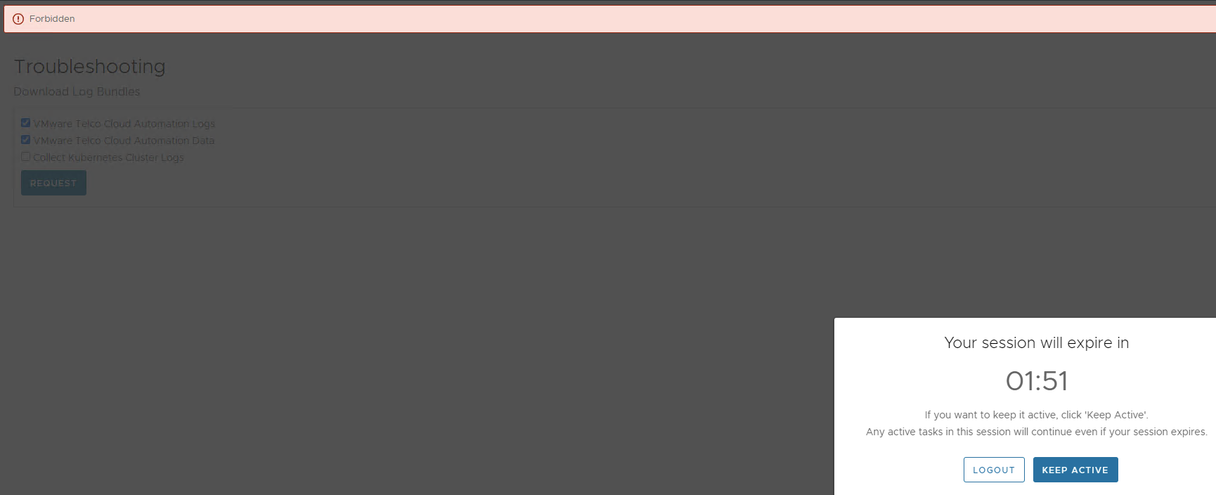 When attempting to log in to TCA Manager (TCA-M) or TCA-Control Plane (TCA-CP), error Forbidden and Your session will expire in XX:XX minutes appears