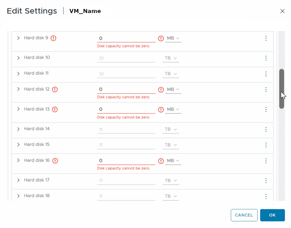"No host is compatible with the virtual machine" is seen for the VM."Virtual disk <hard disk> is a mapped direct-access LUN that is not accessible. In order to proceed with the operation, the target disk's datastore and format must be different than that of the source disk."Validation:
