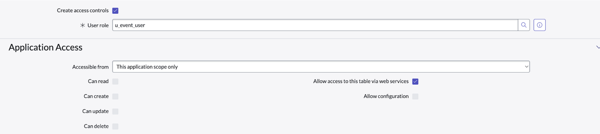 Example Screenshot of sysevent table to create access control: (Note: Enable Allow Access to this table via WebServices if it is not already enabled)