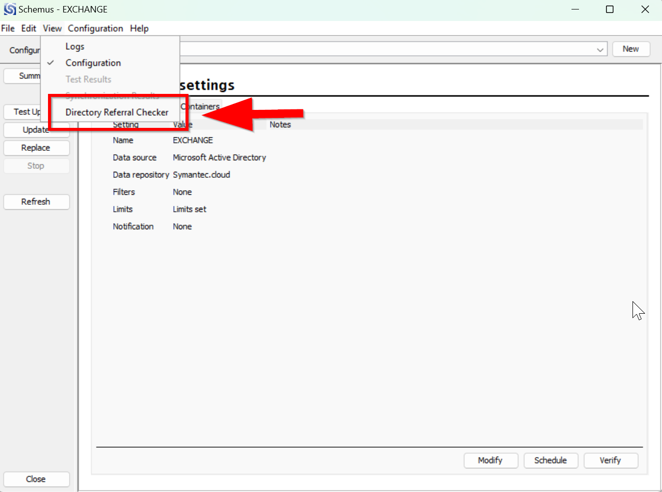 The Directory Referral Checker checks that referrals on the LDAP server can be followed. A tab is shown for each synchronization type and under each of these there is another tab for each LDAP source. Starting at the configured search base for each source, it searches for and follows referrals. The process is repeated for each referral until the search is complete or an error occurs.