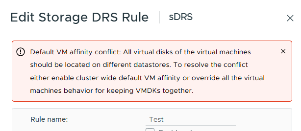 Default VM affinity conflict: All virtual disks of the virtual machines should be located on different datastores. To resolve the conflict either enable cluster wide default VM affinity or override all the virtual machines behavior for keeping VMDKs together.At the sDRS cluster level, the advanced setting "Keep VMDKs together by default" is unchecked. As a result, intra-VM affinity is disabled for all virtual machines within the cluster. This results in a conflict between the two rules.