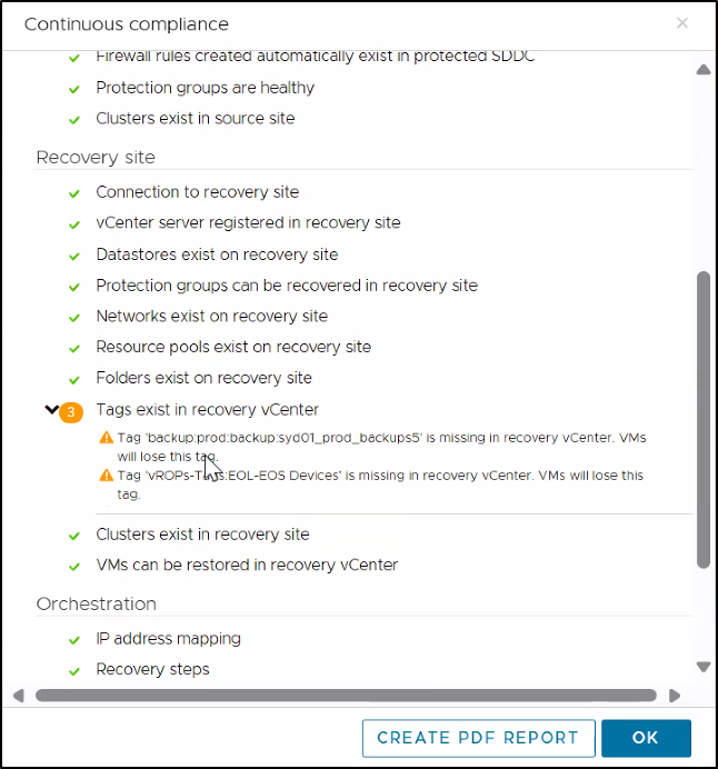 Recovery plan may report below error in Continuous Compliance check.Tags exist in recovery vCenter Tag 'Tag_name' is missing in recovery vCenter. VMs will lose this tag.