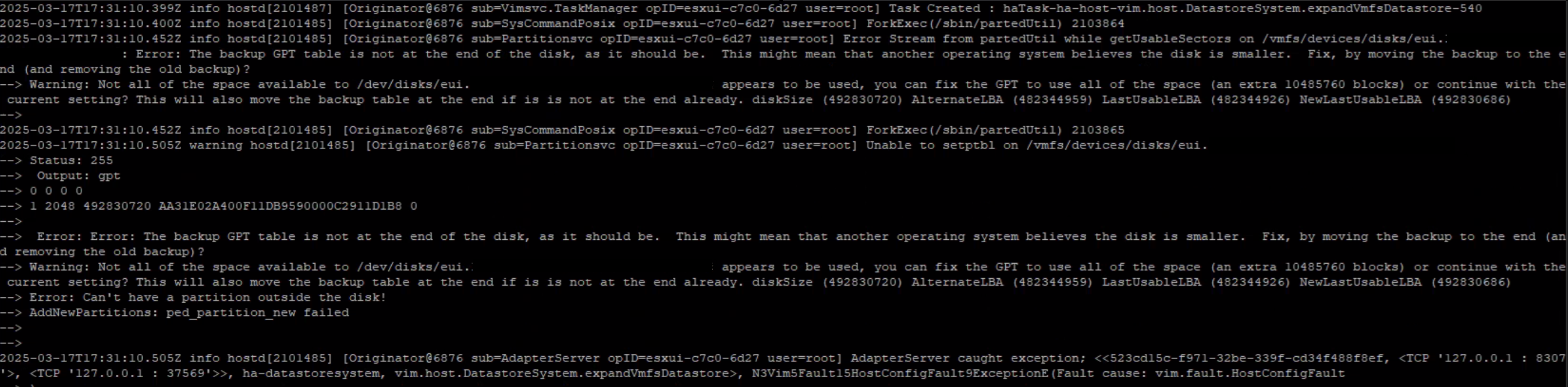 When trying to grow a datastore the operation completes, however the datastore does not show that the size has increased at all in vCenter or directly from the ESXi host.