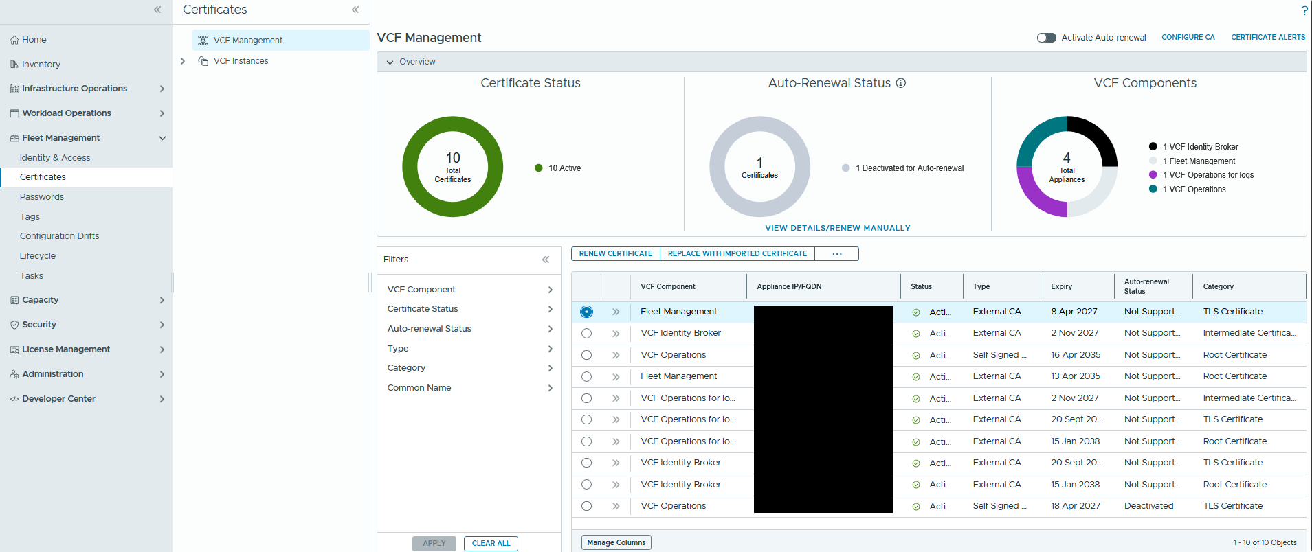 - In the VCF Operations UI, Fleet Management >> Certificates page, it is only possible to select a single certificate at a time.