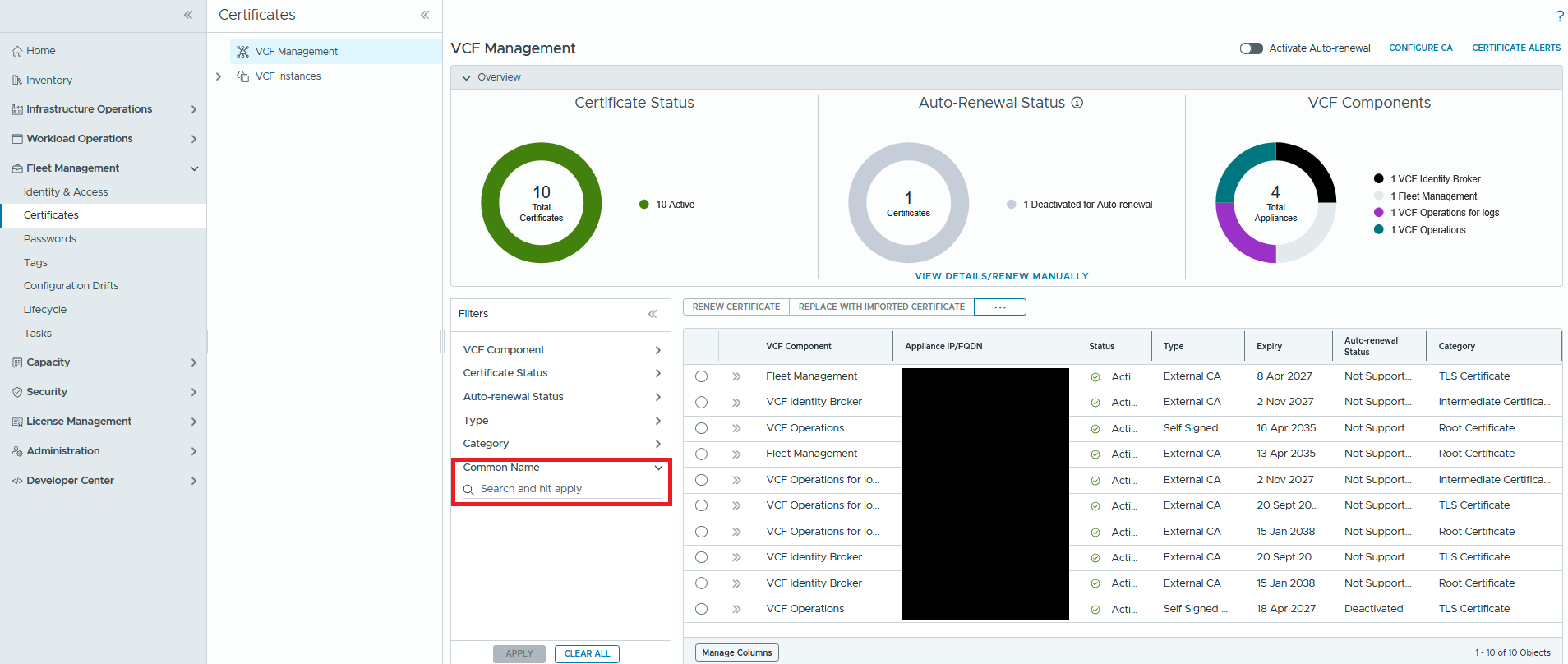 In the VCF Operations UI, Fleet Management >> Certificates page, the search filter is missing.