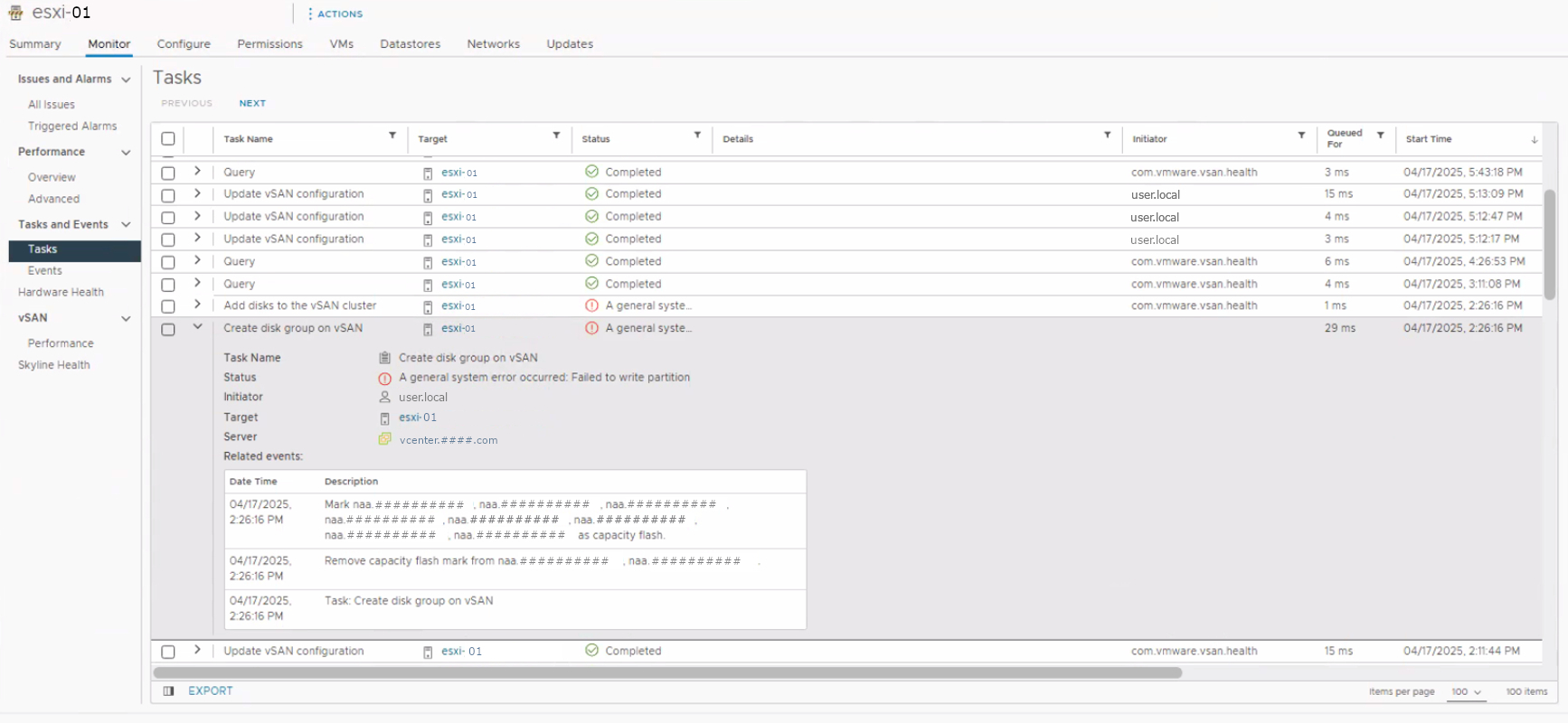 '/var/run/log/vmkernel.log', we see below log entries indicates write error- 2025-04-17T14:14:04.227Z cpu8:2097443)WARNING: HPP: HppThrottleLogForDevice:1136: Cmd 0x2a (0x45dc39bfb9c8, 2103629) to dev "naa.################" on path "vmhba2:C0:T7:L0" Failed: