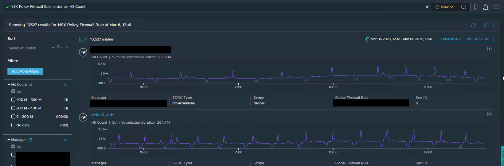 The export of the query "NSX Policy Firewall Rule order by Hit Count" query shows many "blank" rows that contain only hit count data or no data at all.