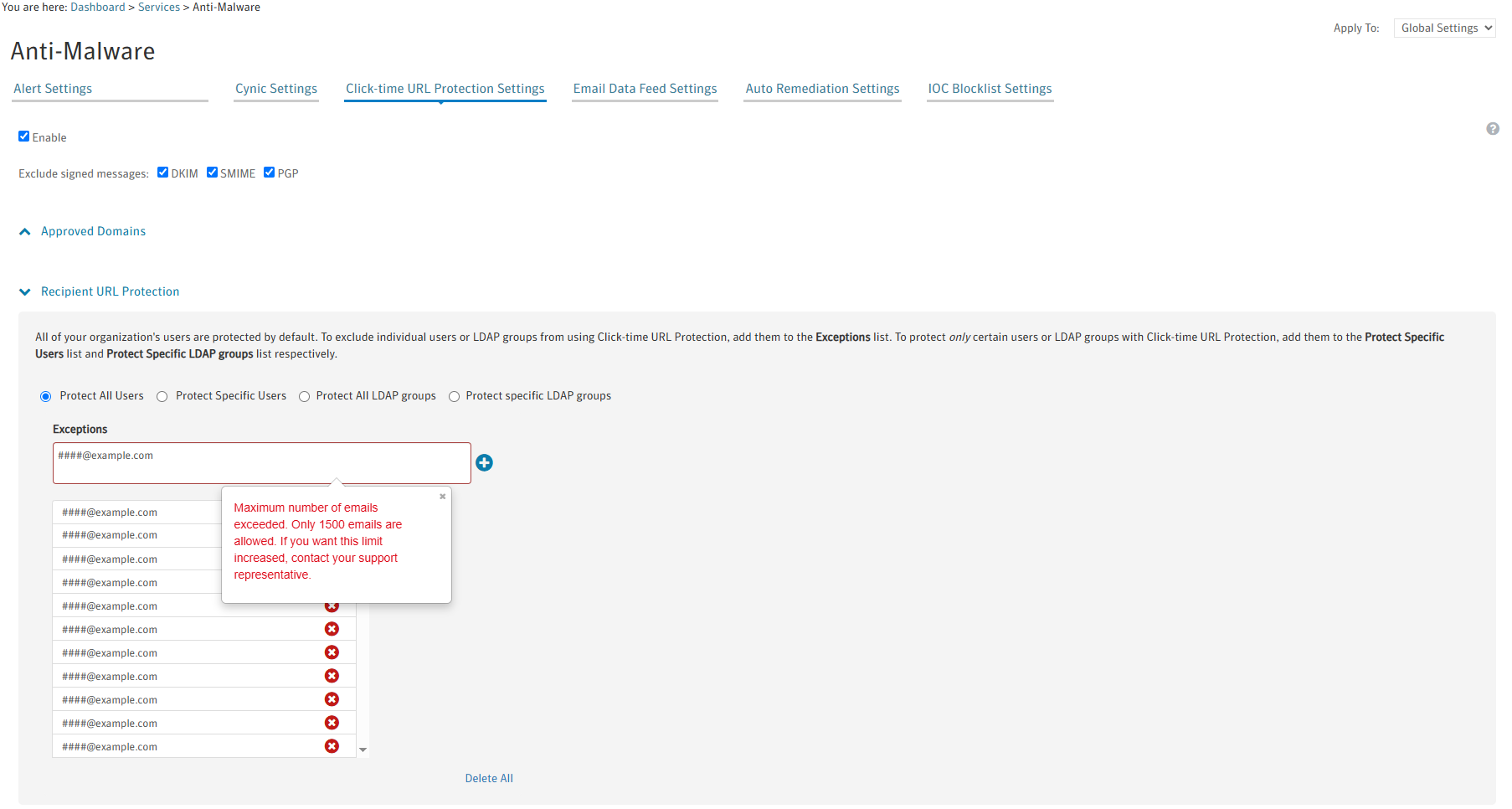 1500 email entries are allowed in the Exceptions list for Click-time URL Protection service.