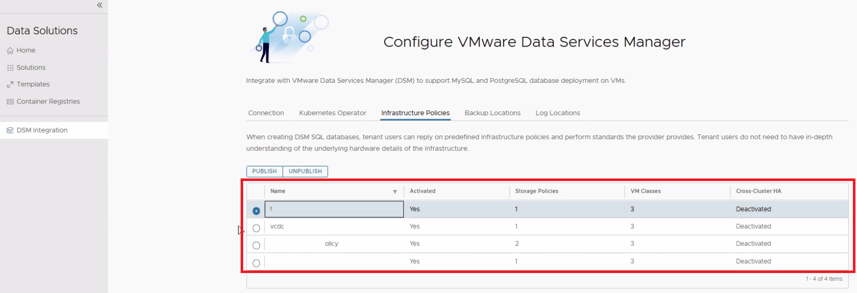 - The below VCD DSM integration UI show multiple infrastructure policies.