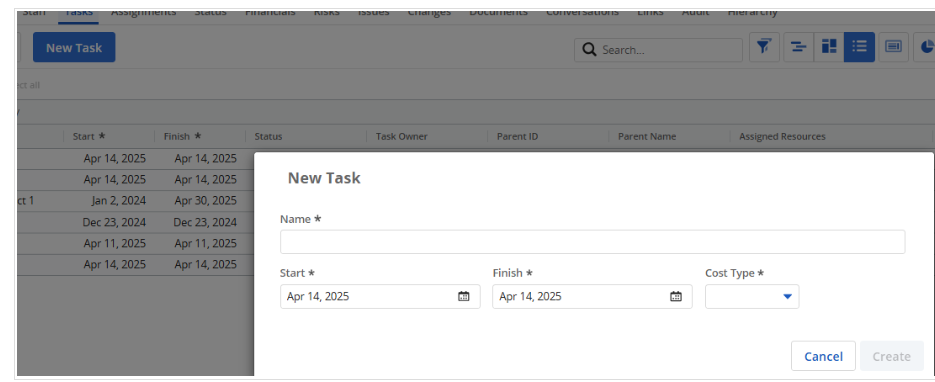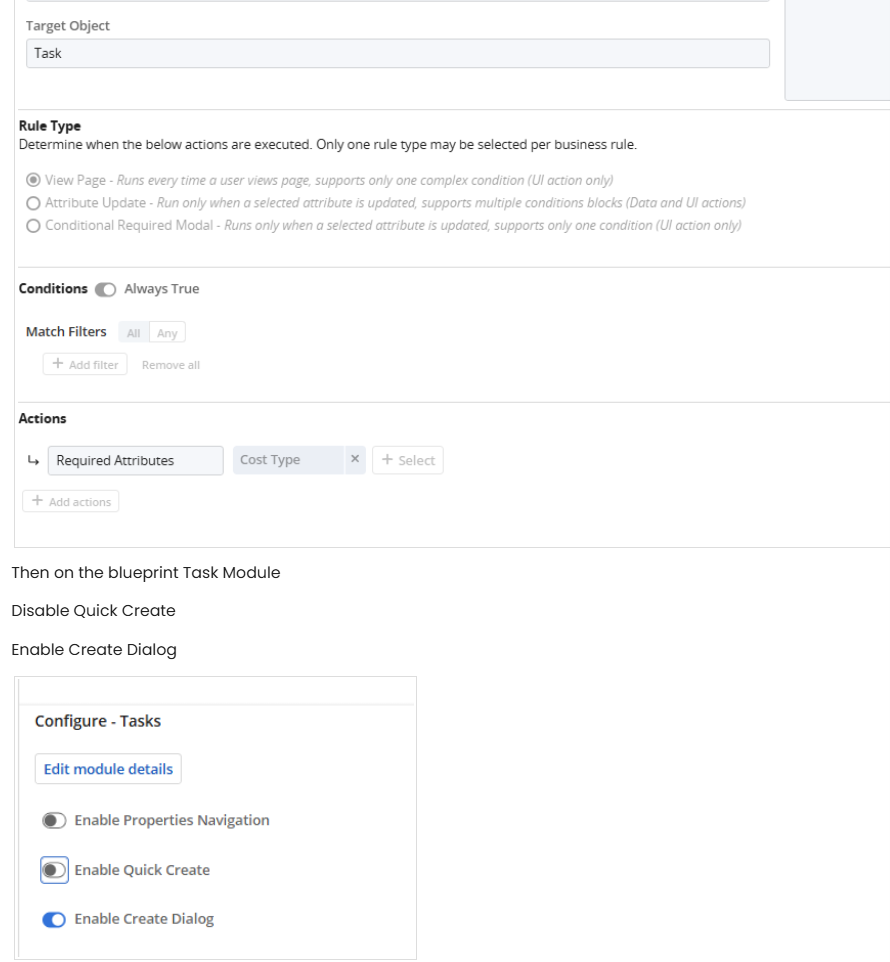By disabling the Enable Quick Create the user will need to click the 'New Task' button which will require the cost type field to be filled in before the task can be saved.