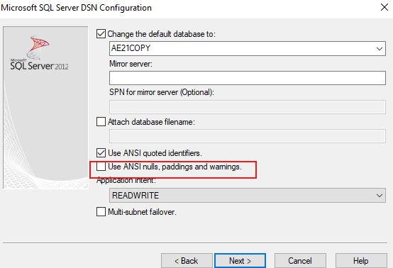 The DSN ODBC of the source database does not have the "Use Ansi nulls, paddings and warnings" checked.