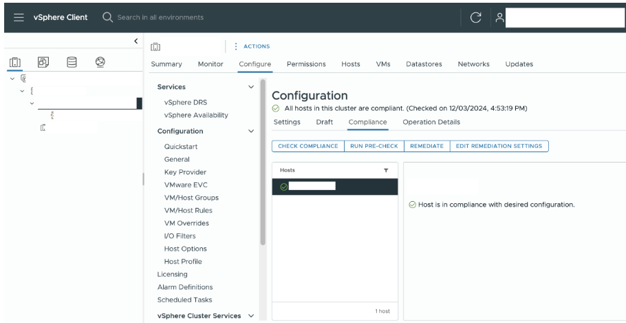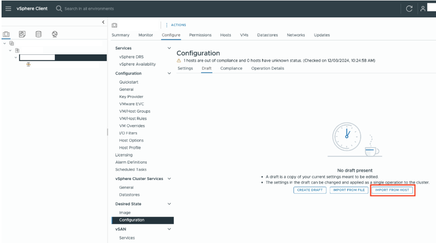 Since VSAN is not yet integrated with the vSphere Configuration Profile (VCP), after enabling vSAN on a VCP enabled cluster, VCP check compliance will report certain drifts in the desired configuration.