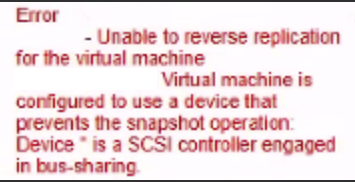 "Unable to reverse replication for virtual machine 'xxxxx'. Virtual machine is configured to use a device that prevents the snapshot operation: Device 'xxx' is a SCSI controller engaged in bus-sharing"