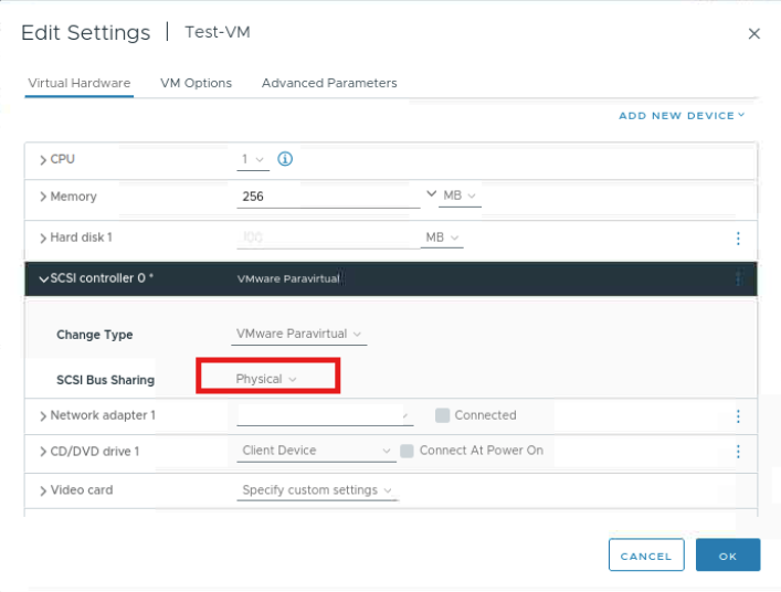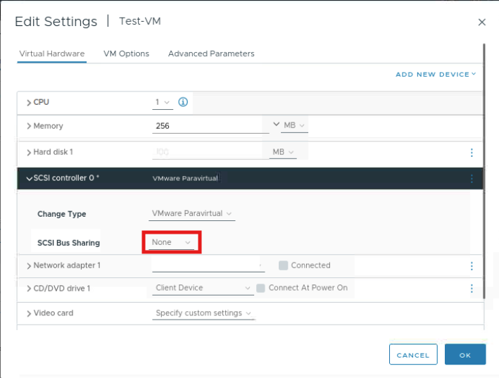 The VM in question has a SCSI Bus Sharing option configured as 'Virtual' or 'Physical':