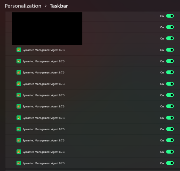 When using the Windows personalization settings page for Taskbar Settings, there are many duplicates of the Symantec Management Agent 8.7.3. The system tray, however, does not show duplicates of the Symantec Management Agent (SMA) tray icon.