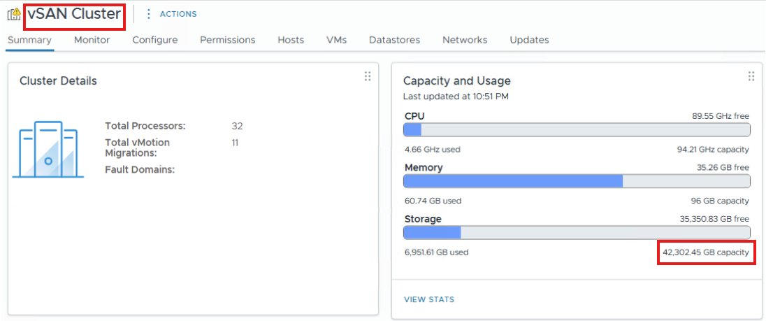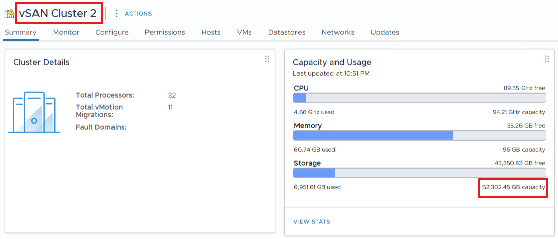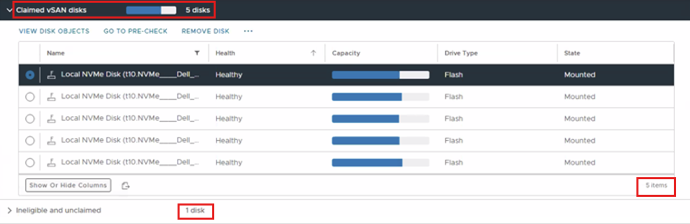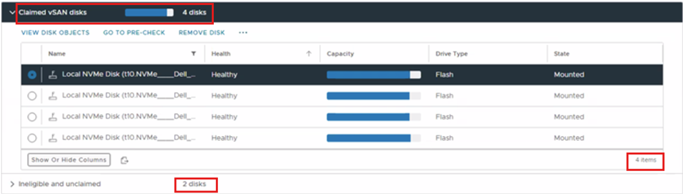 Cluster with larger size has more disks added to the disk group. Select the vSAN cluster > Configure > Disk Management > Select vSAN node > View Disks > Expand the disk group.
