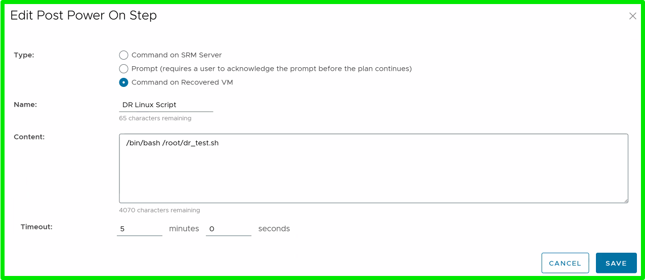 Recovery plan fails to execute a shell script as a post power on step