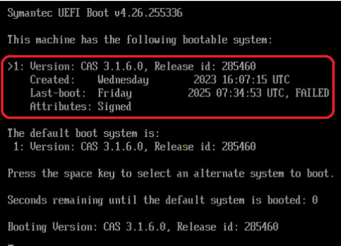 Following Content Analysis virtual appliance operating system reboot, upgrade or new installation it is not possible to access the CAS console. Serial interface console output shows that the last OS boot FAILED, example: